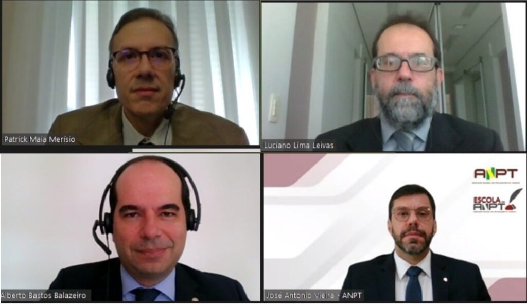 A mesa de abertura do seminário contou com a participação do presidente da ANPT, José Antonio Vieira de Freitas Filho, do procurador-geral do Trabalho, Alberto Bastos Balazeiro, do diretor pedagógico da Escola, Patrick Maia Merísio, e do procurador do Trabalho Luciano Lima Leivas, vice-coordenador nacional da Coordenadoria Nacional de Defesa do Meio Ambiente do Trabalho (Codemat) do Ministério Público do Trabalho (MPT).